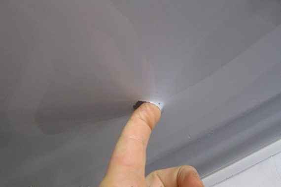 Если полотно чрезмерно натянули при установке, то оно может разорваться. Если размер отверстия невелик, его следует закрепить быстро скотчем во избежание увеличения размера. А затем прошить незаметно капроновой нитью. Самостоятельно это сделать можно, но лучше пригласить специалиста, который знает все тонкости работы с различной фактурой материала. Такая процедура, проделанная на матовом потолке, практически не оставляет следов. А вот глянец подчеркивает дефект, тогда приходится декорировать каким-нибудь элементом.