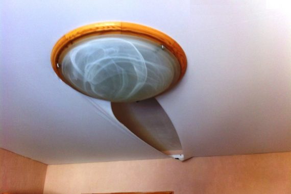 Если полотно оплавилось от близко расположенного светильника, нужно произвести демонтаж прибора, проверить исправность электропроводки, установить дополнительную защиту в виде термокольца. Далее светильник устанавливают на прежнее место.
