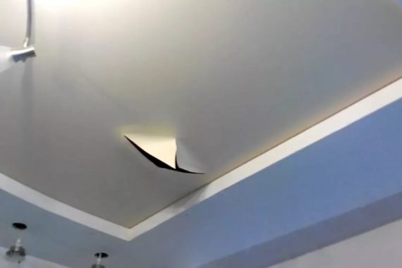 Если соседи затопили, потолок провис под тяжестью воды, его следует осторожно проколоть иглой, спустить воду, аккуратно заделать отверстие.